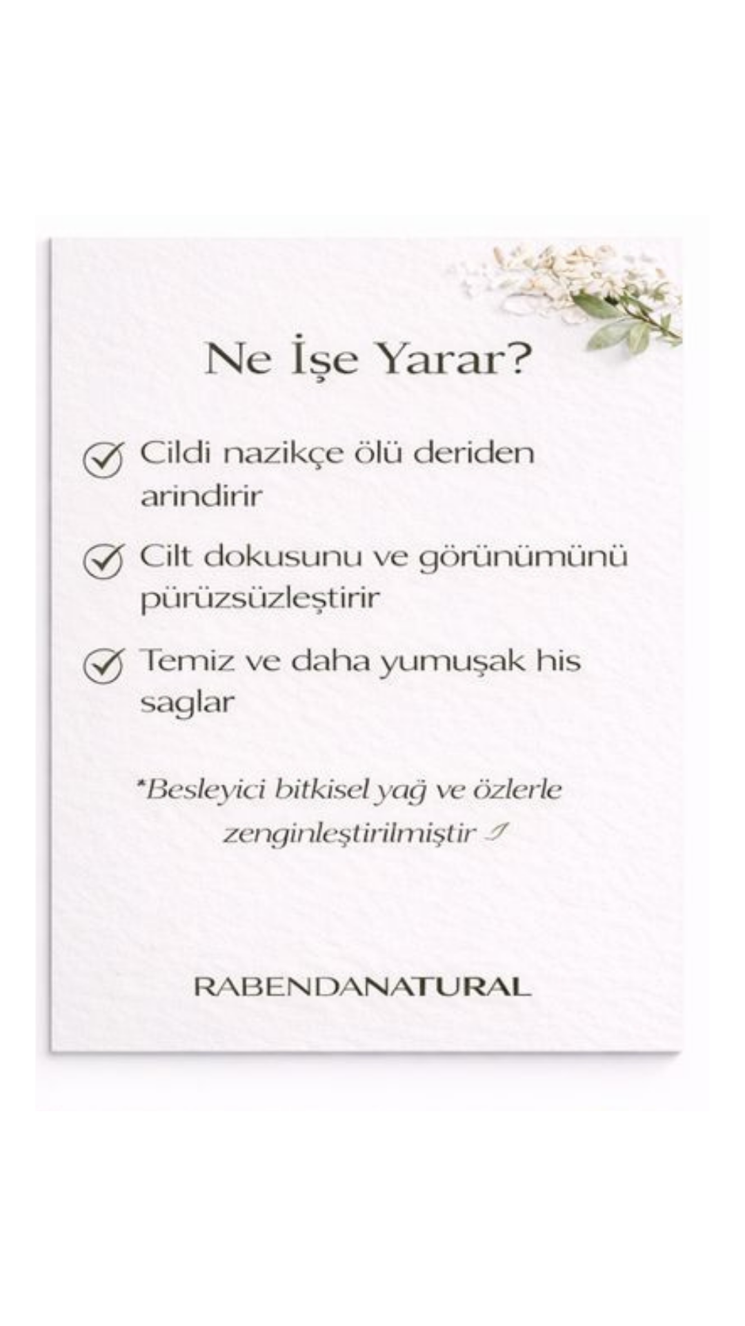 Nazik Peeling, ölü deri hücrelerini nazikçe temizleyen ve cilt yenilenmesini destekleyen haftalık bakım ürünüdür. Doğal enzimler ve yumuşak tanecikler içeren formülü, cildi tahriş etmeden pürüzsüzleştirir, parlaklık kazandırır ve aktif maddelerin emilimini artırır. Tüm cilt tipleri için uygundur.