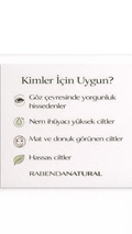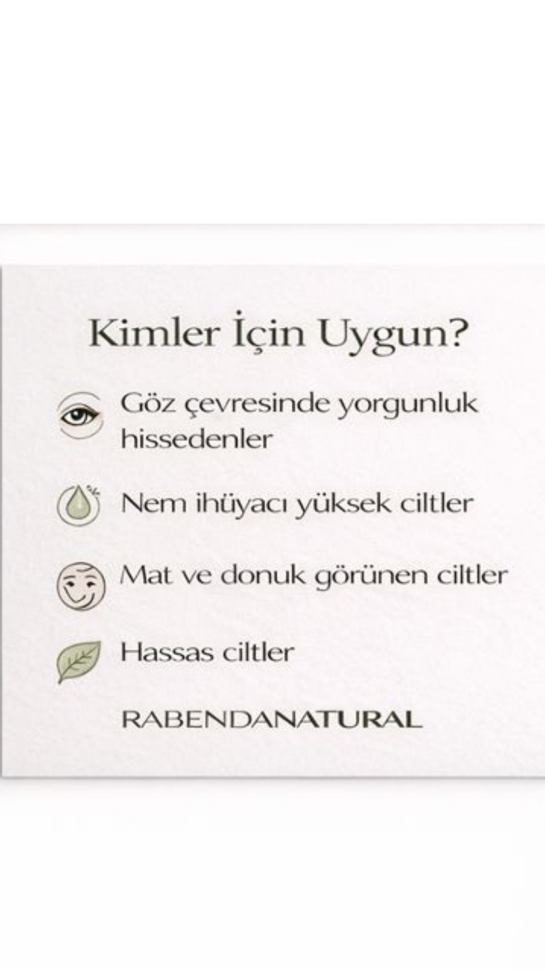 Etkisi: Göz çevresini nemlendirir, koyu halka ve şişlik görünümünü azaltır, ince çizgileri hedef alır ve taze bir görünüm sağlar.